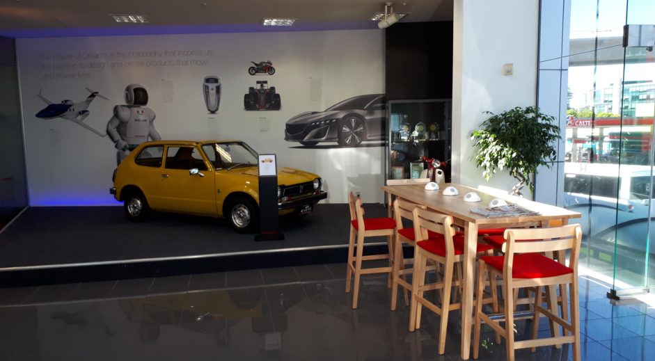 The brief was to reconfigure the existing reception area to also house a service reception facility, which was a relocated from downstairs, and to add a new reception to cater for Honda’s New Zealand’s head office which is also on this site. The other major part of the work was to create a customer lounge in which customers could wait to pick up cars, or just hang out in the type of club lounge situation. There is also a small work space in which customers can work while their cars are being serviced. The showroom also features a museum area to showcase the proud history of Honda.